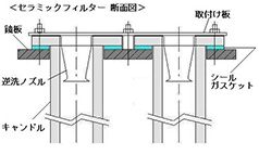 セラミックフィルターは、バグフィルターにおけるフィルターエレメントの替わりにセラミックキャンドルを採用した構造で、セラミックキャンドルの外側で濾過を行い、除去されたダストは、内側より定期的に逆洗をする事により、ダストを払い落とす方式を採用しております。