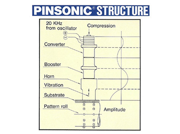 - 超音波による振動エネルギーを利用し、熱可塑性繊維を熱融着させる装置(サーマル・ボンディングマシン)